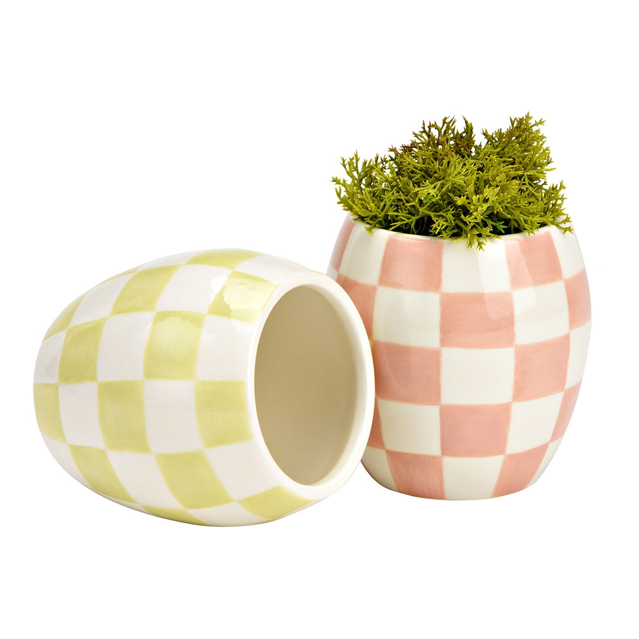 Blumentopf kariert aus Keramik, 2-fach, Weiß/Rosa (B/H/T) 8x9x8cm