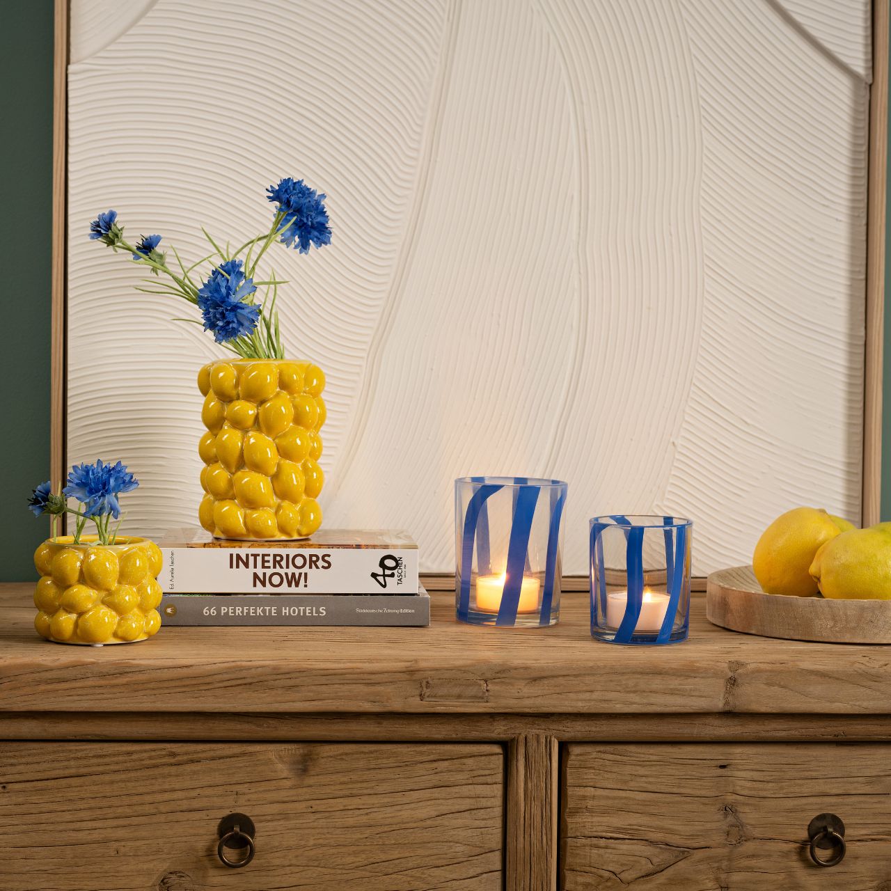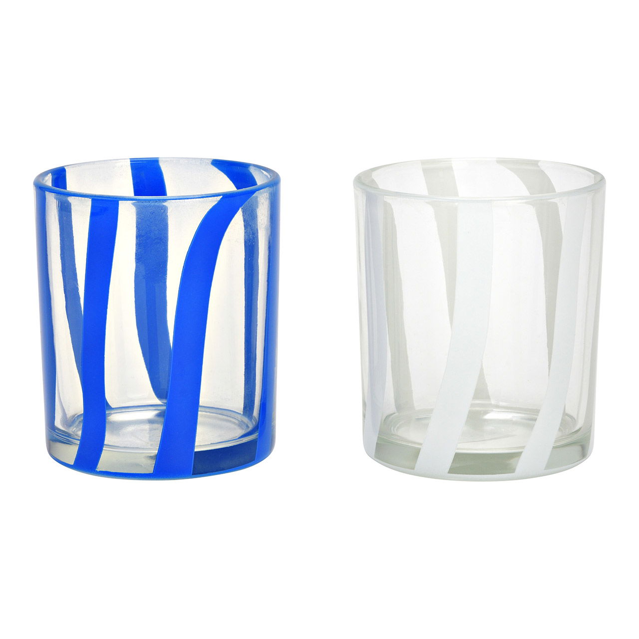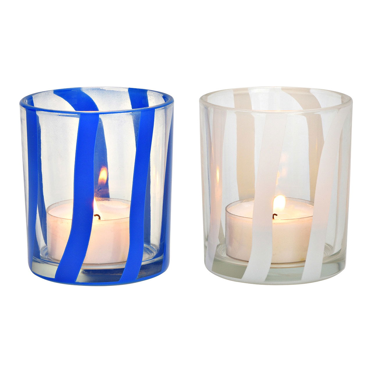 Windlicht gestreift aus Glas 2-fach, Transparent/Blau/Weiß (B/H/T) 9x10x9cm