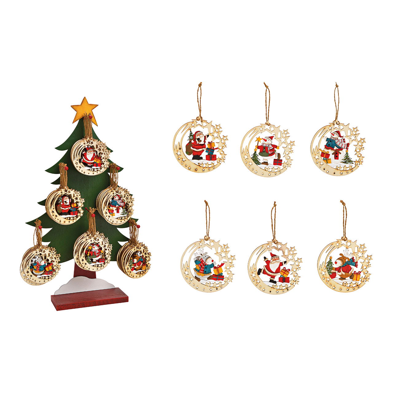 Weihnachtshänger Mond Nikolaus Schneeman Elch Dekor auf Baumständer aus Holz, 6-fach, Bunt (B/H/T) 10x10x0.5cm/34x58x10cm
