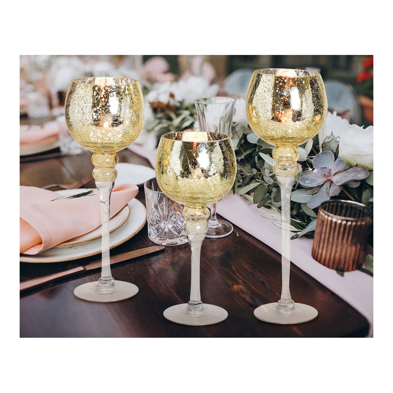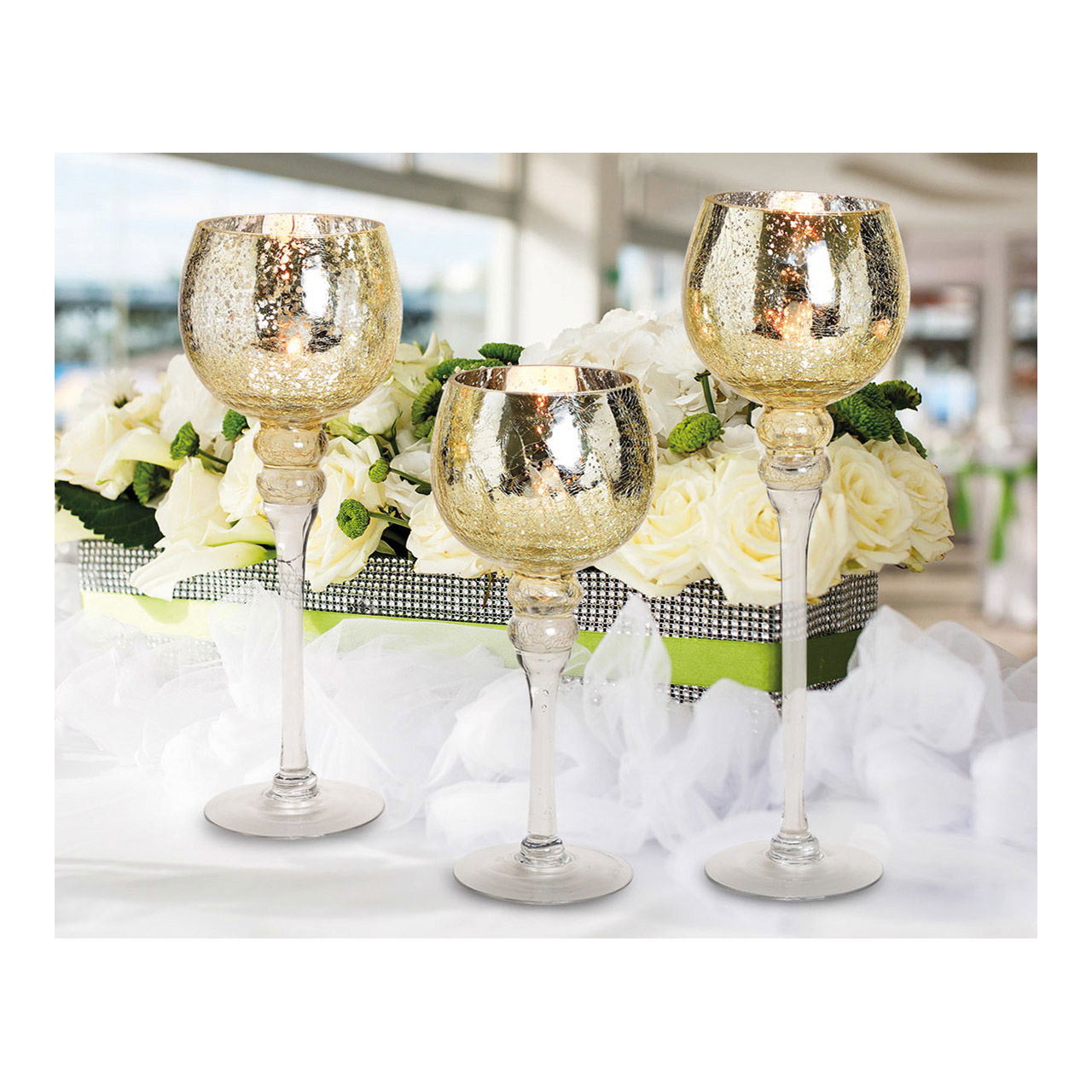 Windlicht Set Kelch Cracking Gold 30, 35, 40cm x Ø13cm aus Glas 3er Set
