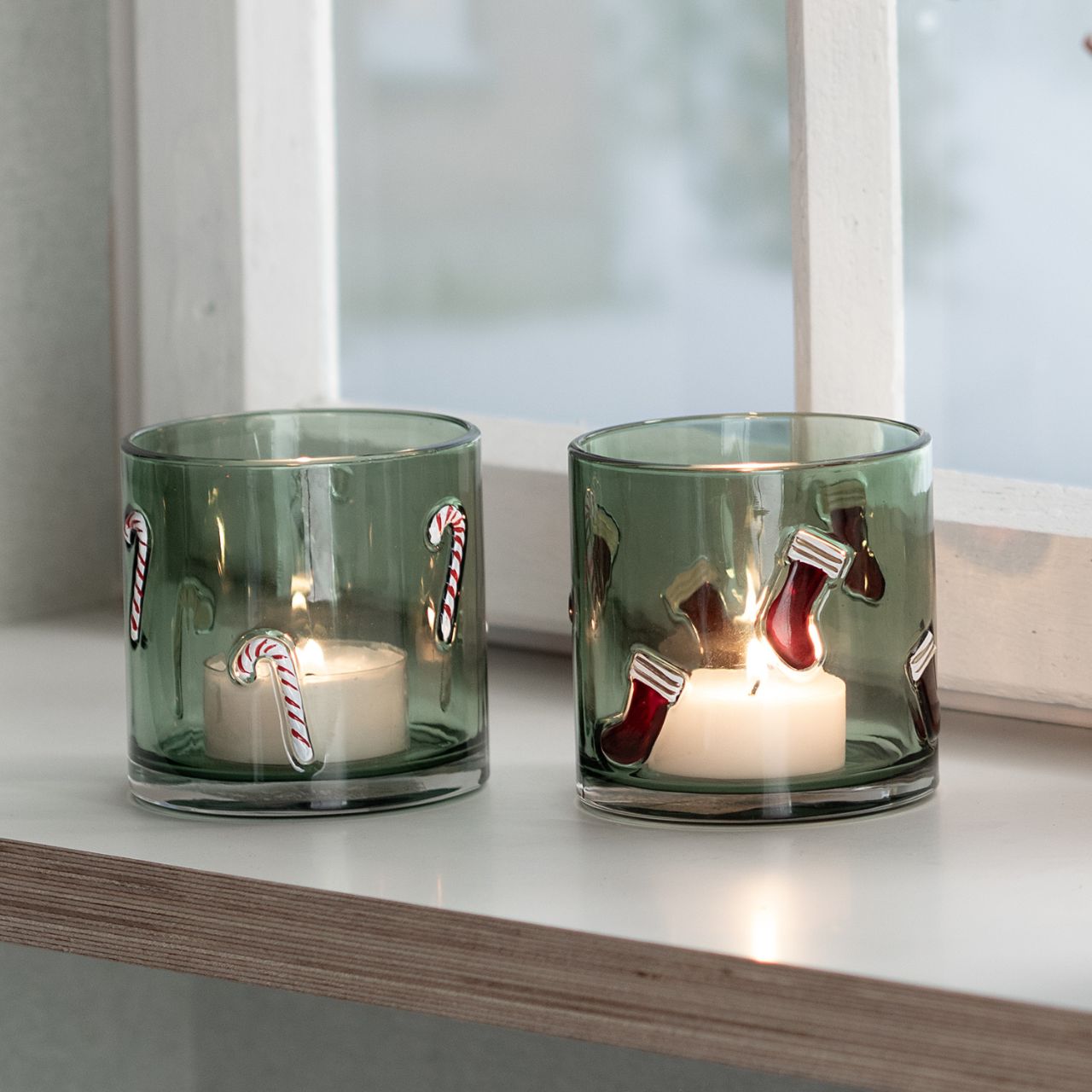 Réf. produit : 10043541 Photophore décor branche de sapin en verre, vert (L/H/P) 9x10x9cm