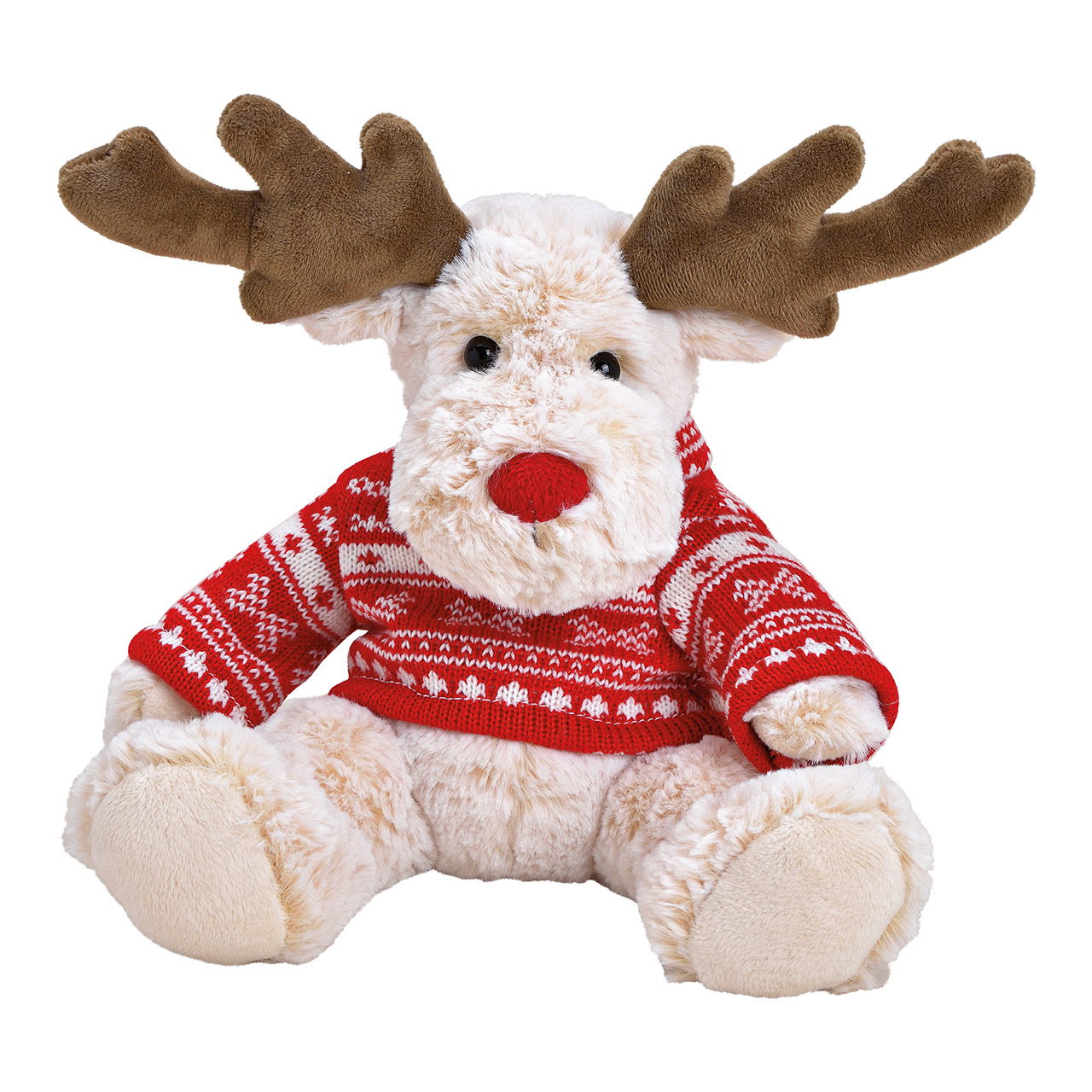 Élan en peluche Beige, pull rouge en tricot (L/H/P) 23x29x13cm