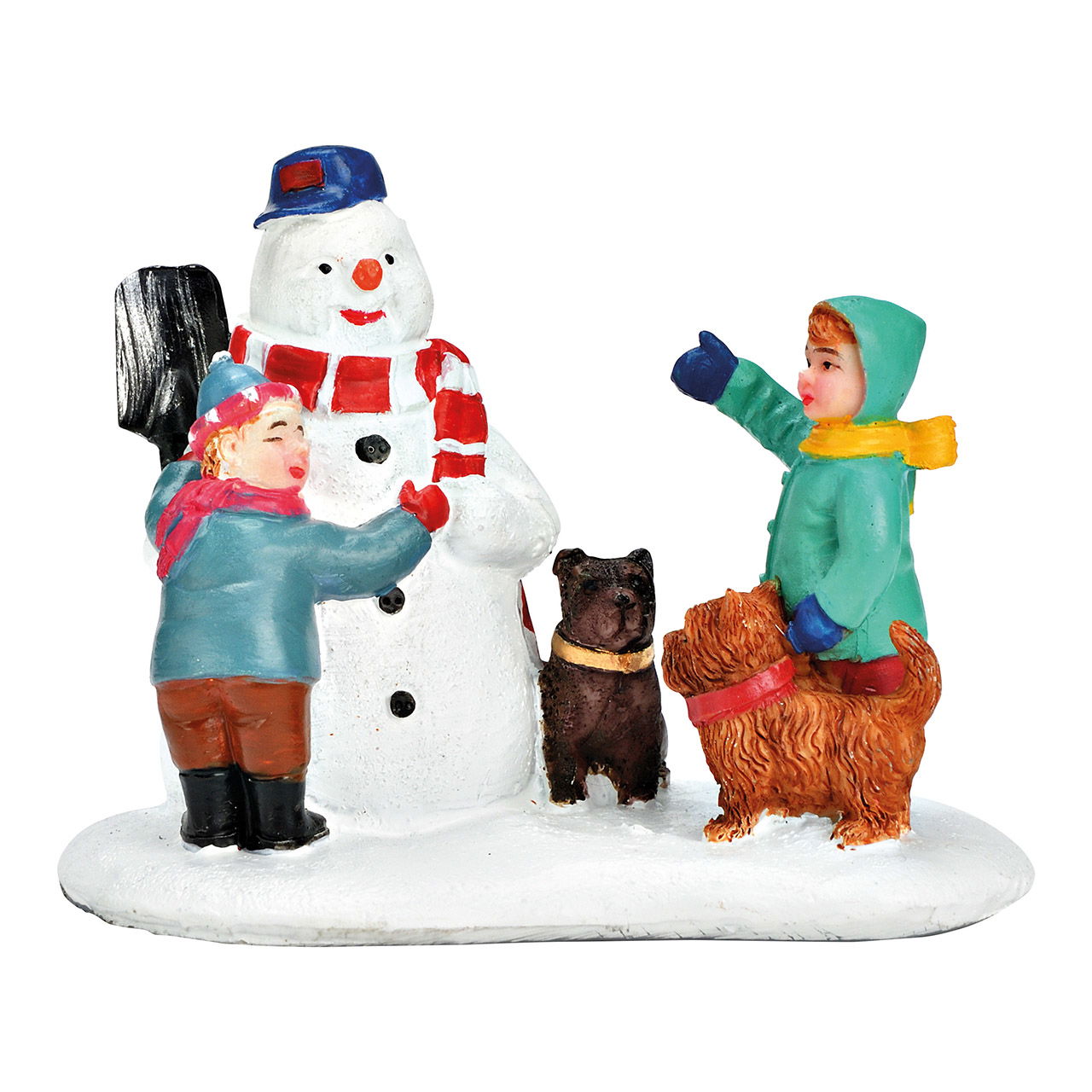 Enfants miniatures avec chiens, bonhomme de neige en poly multicolore (L/H/P) 10x7x5cm