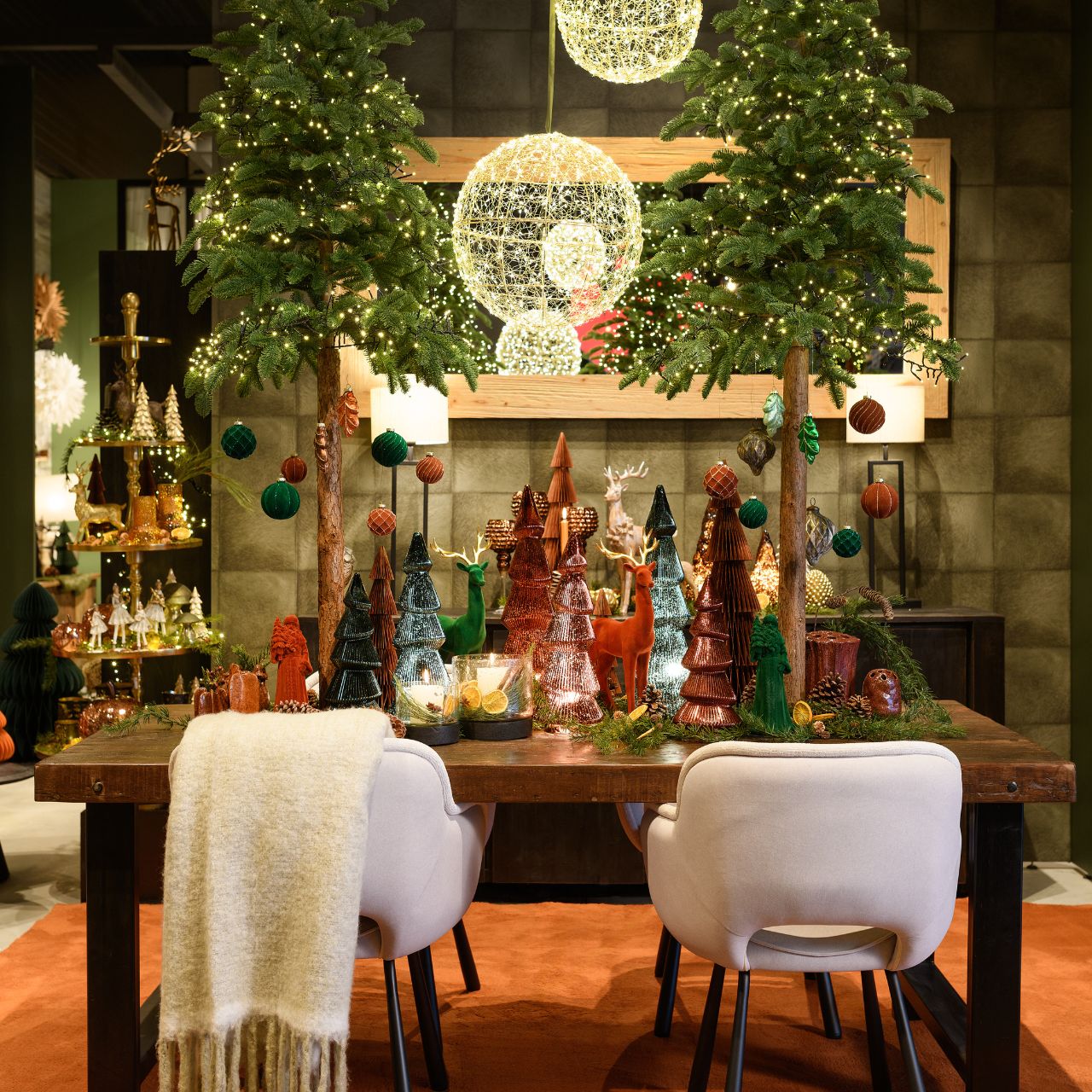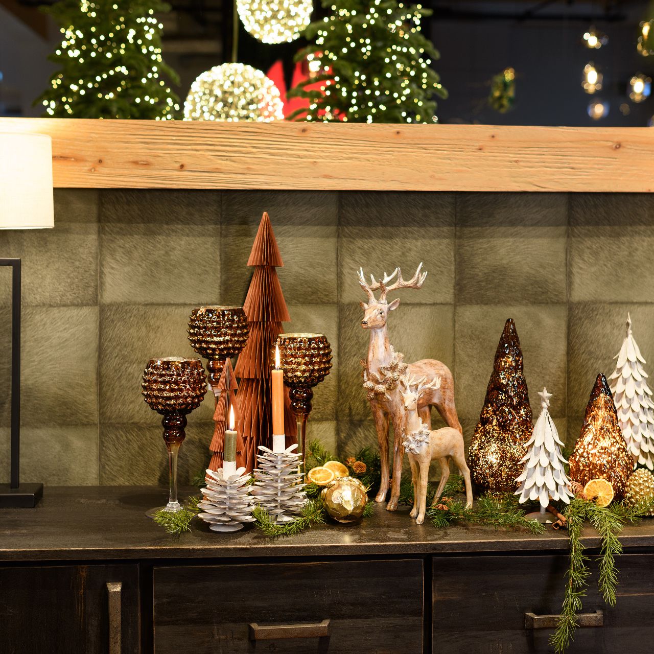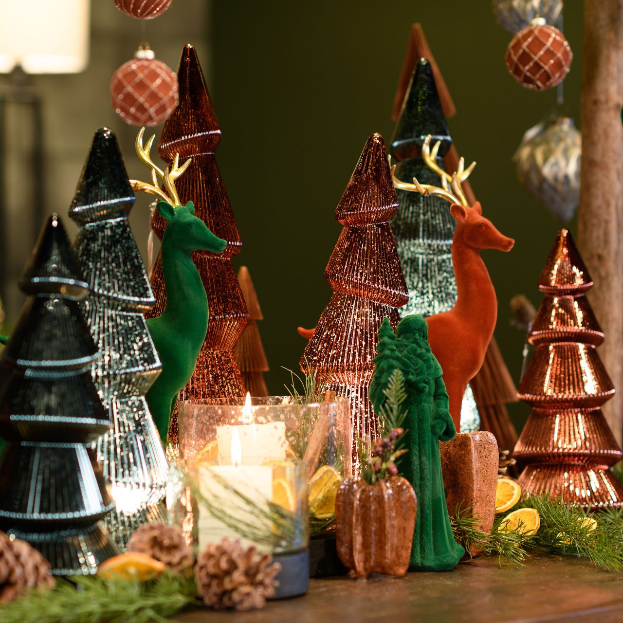 Sfumature di verde, colori caldi della terra e materiali naturali come il legno e il feltro: Amber Forest combina le moderne decorazioni natalizie con la magia rilassante della foresta.