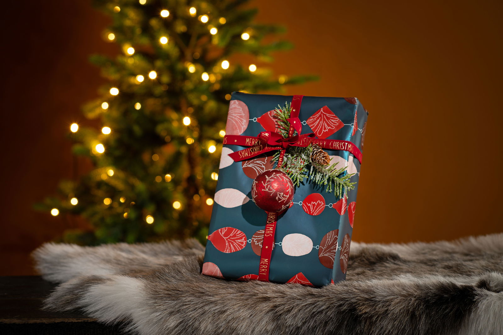 Article number: 10022700 Gift bow, plastic, deer design, beige color with gold silver red designs, 3 asst. 26x40x7cm