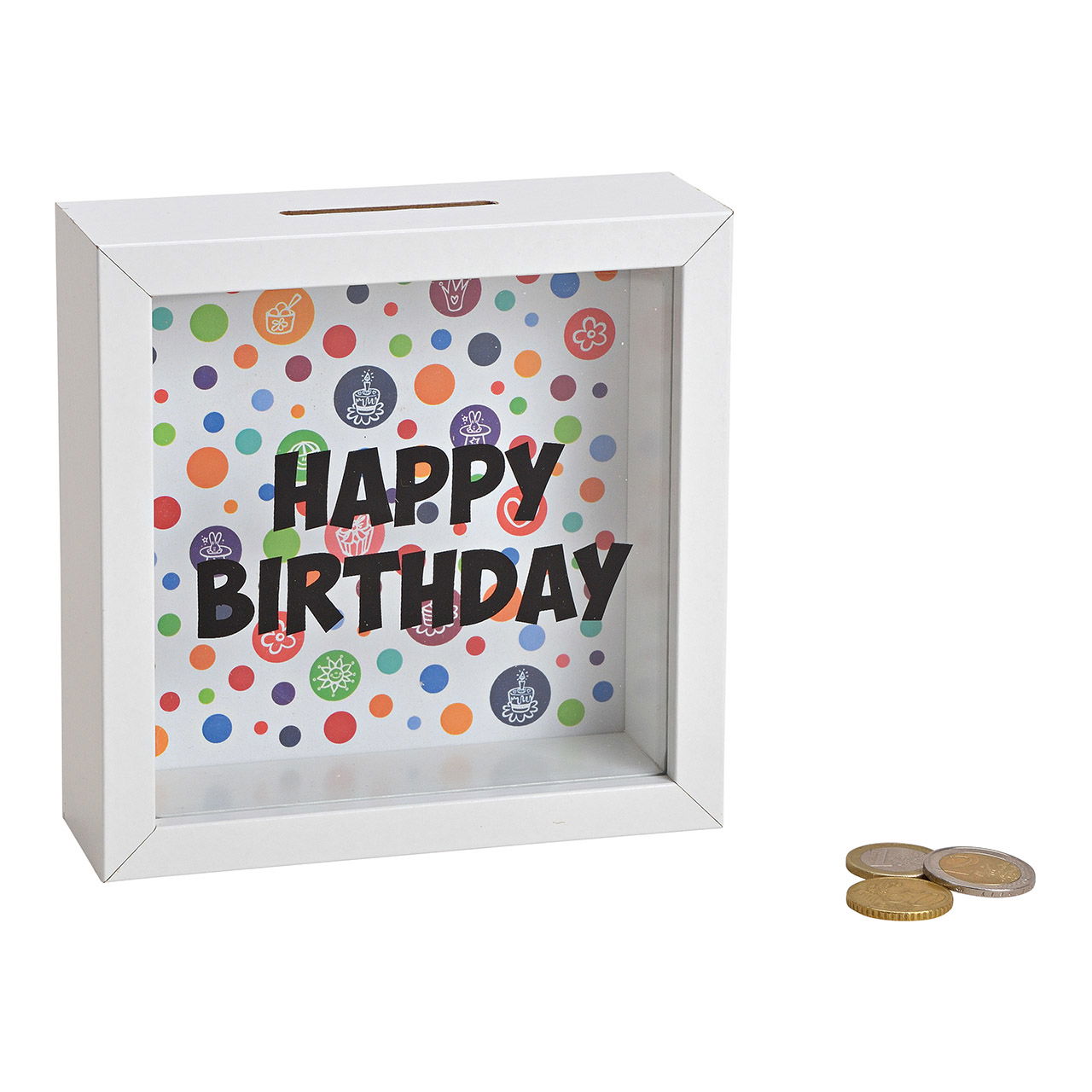 Spardose Happy Birthday aus Holz, Glas Weiß (B/H/T) 15x15x5cm